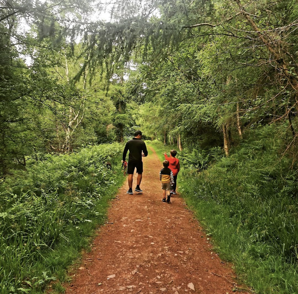 Take the lower trail through the gap in the fence right next to the route map sign. This leads you onto a wide muddy path running right through the heart of the woods. Dogs can run freely here- mine enjoy tearing through the woodland off the beaten track, chasing each other and exploring the undergrowth, disappearing from sight regularly only to reappear 100 yards or so away down the steep hillside to the left of the path- tongues out and ‘happy faces’ permanently on! This walk is super child-friendly, there are plenty of ‘things’ to see and collect- pine cones are strewn along the path and there are plenty of twigs lying about for on-the-go sword fights/ spell casting/ pole-vaulting whatever you fancy really! A couple of hundred meters into this walk there used to be a carved wooden frog at the left side of the path, whos body was decorated with hundreds of pennies that had obviously been hammered into the wood- my kids used to love ‘cuddling the frog’ and trying with all their might to pull the pennies out to no avail. Sadly though, following the coronavirus lockdown, it would appear that the poor frog has been destroyed, and on our last few visits all that is left is his plinth- sad times indeed! A little further down from here you might notice a little path that leads to a tree on the left where you will find the first little fairy-house of the trail up in the tree.